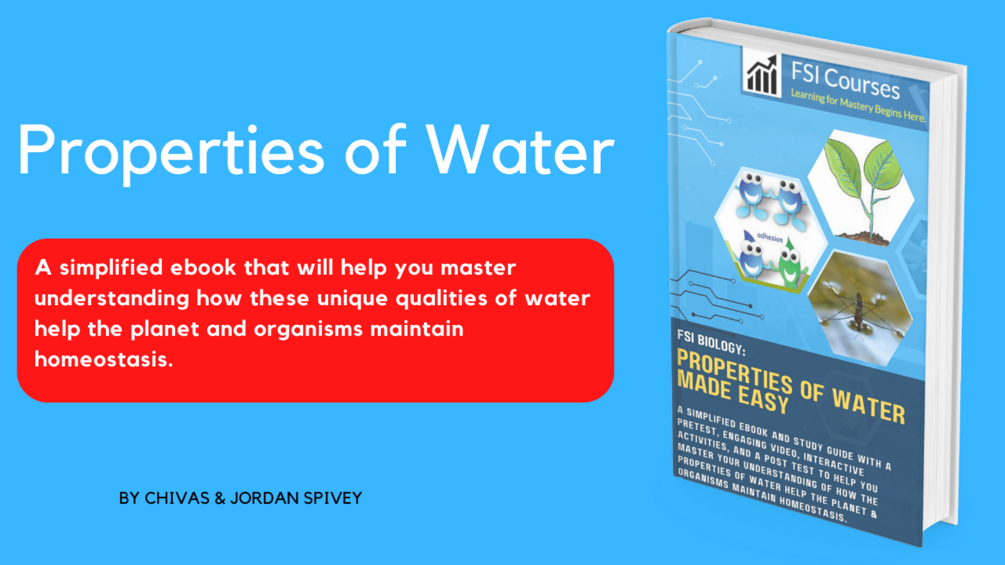 Get your properties of water ebook to help you master how these unique qualities of water help the planet and organisms maintain homeostasis. This ebook covers the major properties of water including cohesion, adhesion, surface tension and several more. Email us at fsicourses.net@yahoo.com for more information or assistance. Upon purchase, you will receive a special code to access your ebook.